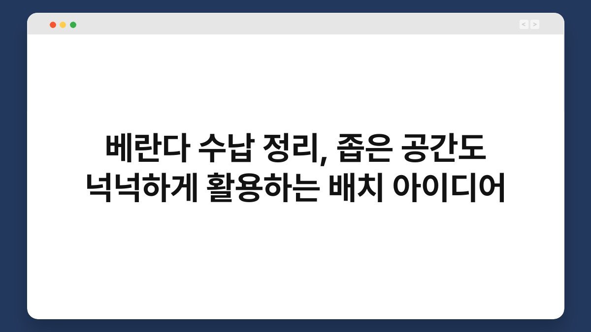 좁은 공간에서의 수납은 많은 사람들이 고민하는 문제입니다. 특히 베란다는 종종 활용도가 낮아 방치되기 일쑤인데요. 이 공간을 효율적으로 정리하고 수납하는 방법을 찾는 것은 매우 중요합니다. 저도 예전에 베란다에 쌓인 물건들 때문에 고민을 많이 했던 기억이 납니다. 하지만 다양한 배치 아이디어와 수납 팁을 활용하니, 공간이 훨씬 넉넉하게 변모했습니다. 이 글을 통해 여러분은 베란다 수납 정리의 중요성과 좁은 공간을 효과적으로 활용하는 배치 아이디어를 알게 될 것입니다.
